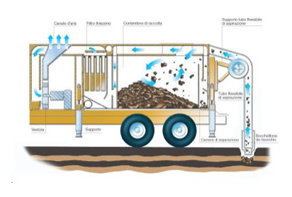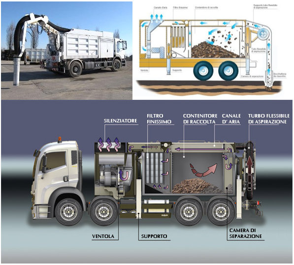 La macchina sfrutta il trasporto pneumatico all’interno del tubo di aspirazione di diametro 250 mm, con un massimo di volume aria paria a 40.000 Mc/h ed una depressione massima di aria di 40.000. Pa (0.4). L’aria viene convogliata un una serie di 52 filtri composti da membrane con celle fino a 0.2 micron.